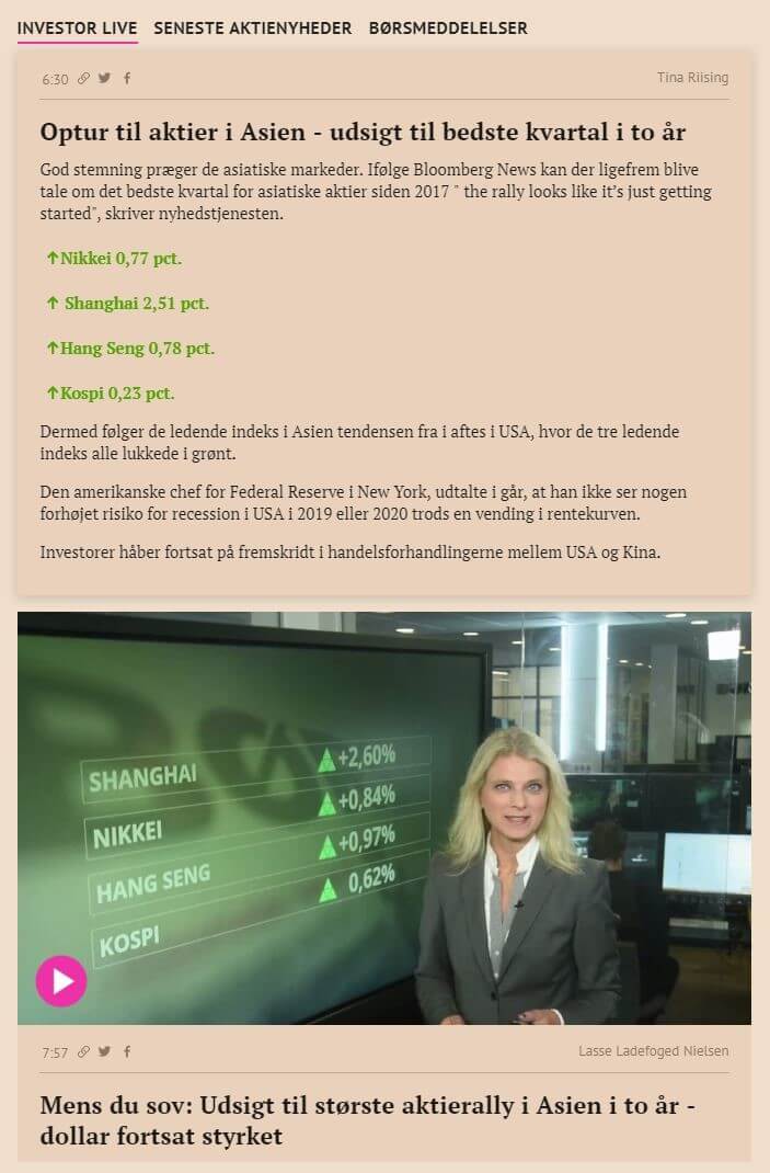 During market hours, content is created both natively inside Børsen Investor through the Live Center solution, automatically retrieved from Børsen’s CMS, and requested from multiple external sources. Content includes videos produced by Børsens video department Play, live market updates, thumbnails to full-length articles, shorter posts, tweets, etc.